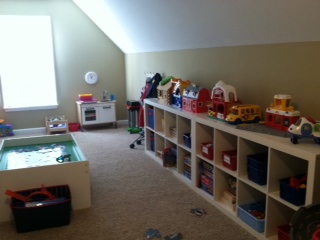 When preparing for our whirlwind house hunting trip here in Georgia, Evan and I came up with a short list of must-haves for our new home. My contribution to our list was a playroom! The house we ended up buying was the second one we looked at (of 25 total!) and to be honest, as soon as I saw the potential to use this room as a play space I was sold. I just knew this would work well for our family. The playroom is upstairs and adjacent to both boys' bedrooms (a lot of homes we looked at had play/rec rooms in the basement, but I didn't want our kids a whole flight of stairs away while I was cooking or busy with other things in the main part of the house). Our playroom also has a small office adjacent, which I have claimed as my mom space. My mom room is currently a hot mess of boxes, but eventually I envision space for my computer and scrapbook supplies. The playroom is also right around the corner from the laundry room and I'm finding that I can be upstairs and within ear shot while the boys play, but still get a few things done...laundry, e-mail, cleaning, etc. I can pop in and join them in their play for a bit and then keep busy upstairs with all of my mom jobs :)